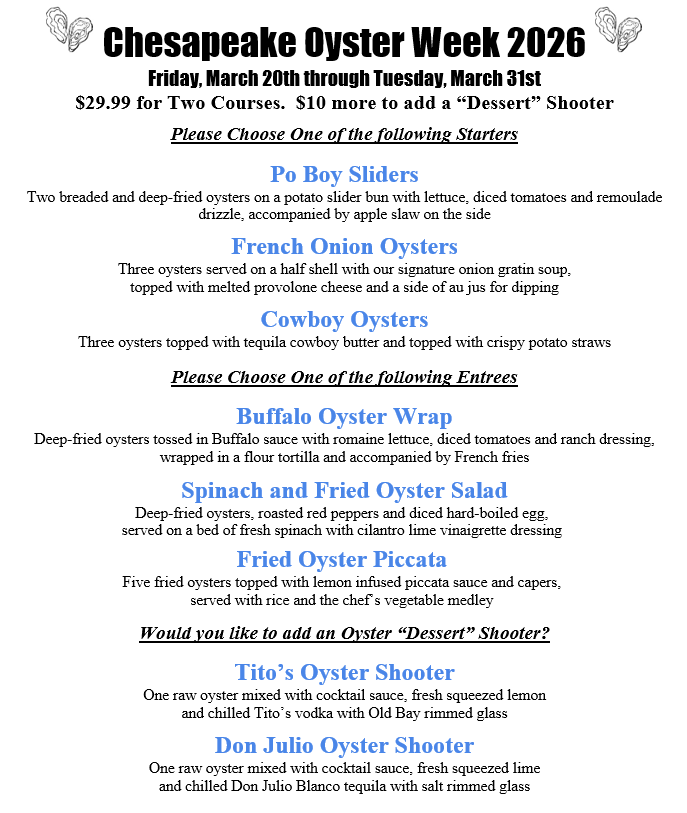 Oyster Happy Hour, M-F 4-7 PM! $10 1/2 dozen Chesapeake Oysters on the Half Shell