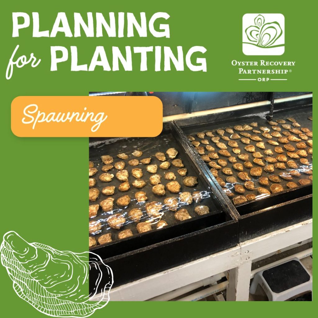 Part 2: Oyster SpawningOyster reproduction is an amazing process where all fertilization occurs outside the oyster in the water column. Once adult oysters are ready to spawn (or reproduce) they are placed on a table where warm water flows over them to simulate summer conditions. Females clap, releasing the eggs in a puff, while males release sperm in a continuous stream into the water. Hatchery staff separate spawning oysters to collect the eggs and sperm. Once the eggs are fertilized, they begin to develop into larvae. These larvae are transferred to large tanks to eat and grow… Example from Horn Point demonstrating their process for spawning…